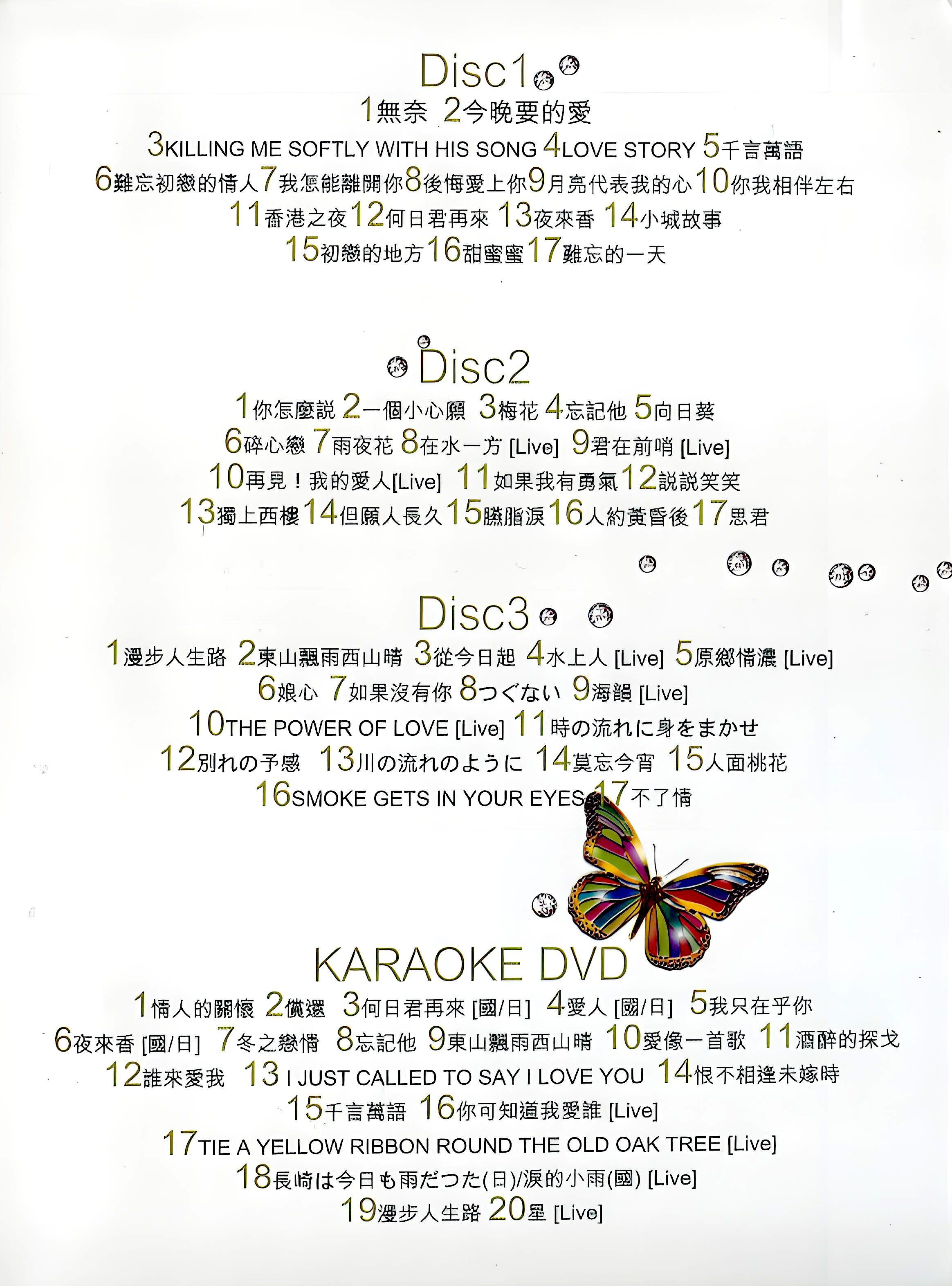 CD3重点收录了她的粤语名曲《漫步人生路》,多首在日本发展期间的代表作(如《つぐない》《时の流れに身をまかせ》),以及部分英语歌曲和现场演绎,展现了她在国际舞台上的风采。